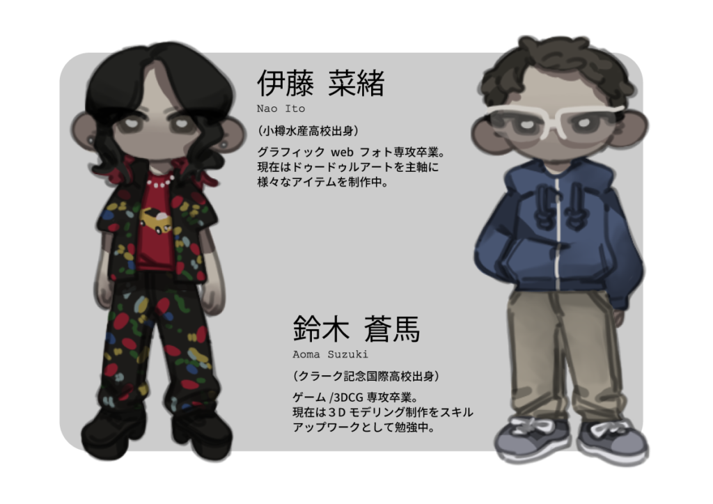 伊藤(菜):札幌デザイナー学院は自由にやらせてもらえる部分もあるのでやりたいことを決めてから入学したほうがいいと思います。研究科に入って良かったことはみんなに会えたことや先生との関りがとても増えたことです。先生と趣味のものを一緒に制作したり、個別で仕事の依頼がきたり、生徒の中のひとりというよりは一個人として接してくれることが増えたような気がしてます。
